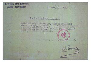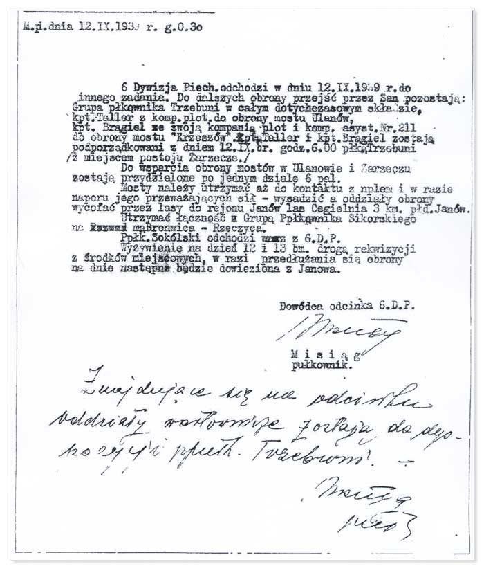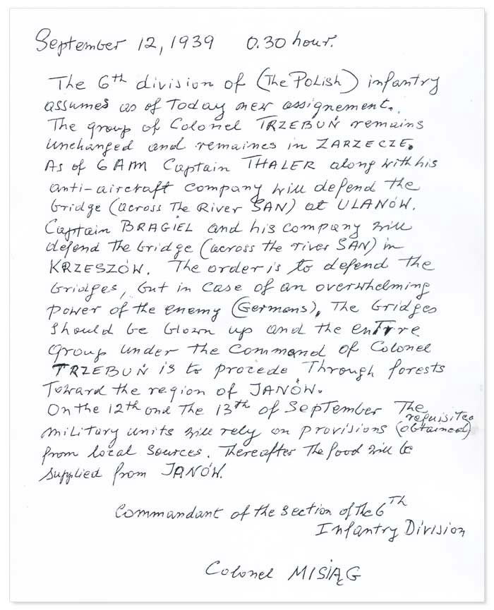 ![]() click image to enlarge Translation: September 12, 1939 0:30 hour The 6th division of (The Polish) infantry assumes as of today new assignment. The group of Colonel Trzebunia remains unchanged and remains in Zarzecze. As of 6am Captain Thaler along with the anti-aircraft company will defend the bridge (across the river San) at Ulanow. Captain Bragiel and his company will defend the bridge (across the river San) in Krzeszow. The order is to defend the bridges, but in case of an overwhelming power of the enemy (Germany), the bridges should be blown up and the entire group under the command of Colonel Trzebunia is to proceed through forests toward the region of Janow (Lubelski). On the 12th and the 13th of September the military units will rely on provisions requisited form local sources. Thereafter the food will be supplied from Janow. Commandant of the section of the 6th Infantry Division Colonel Misiag |